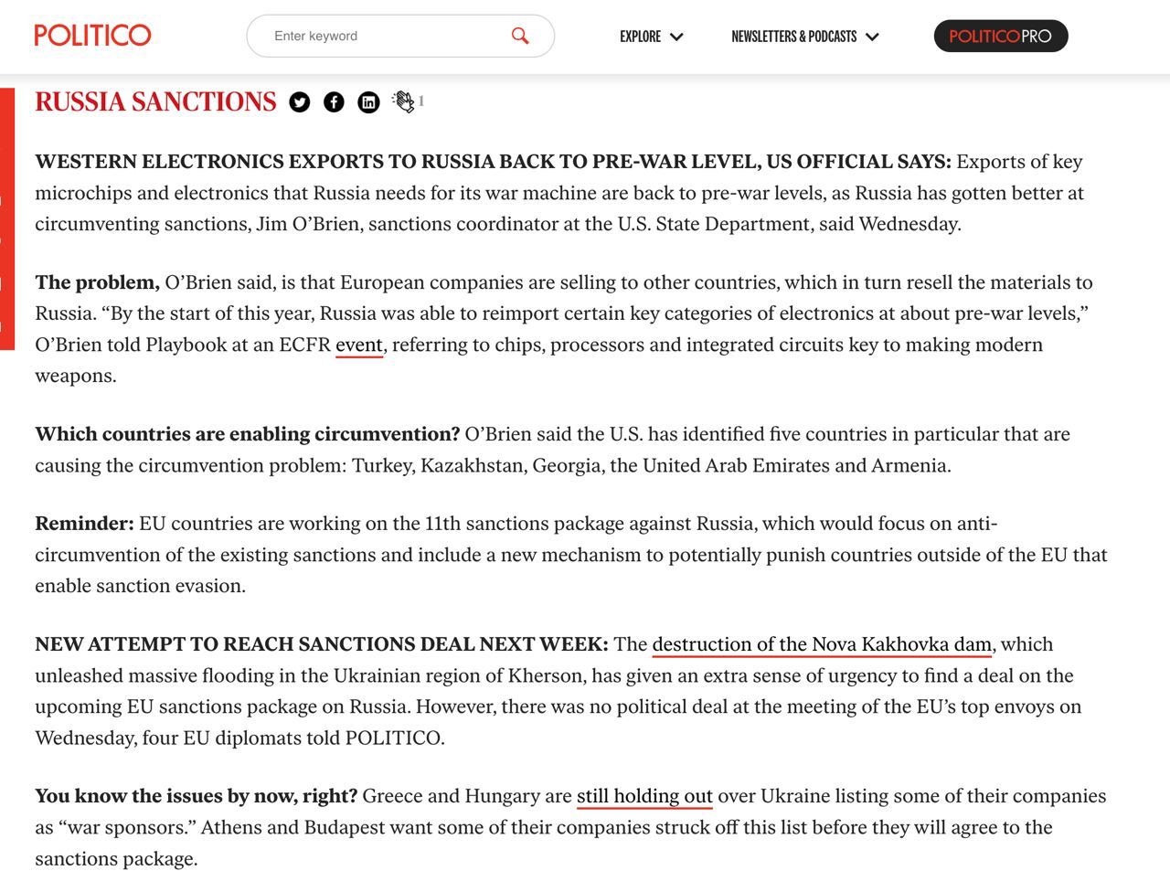 Решение блокируют Греция и Венгрия, требуя исключить свои компании из списка тех, кто помогает РФ обходить санкции.