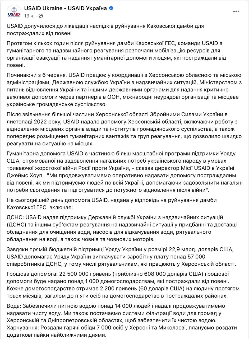 "Каждое домохозяйство получит 2 200 гривен на человека в течение трех месяцев, в общей сложности до пяти человек на домохозяйство в пострадавших районах", - говорится в сообщении USAID.