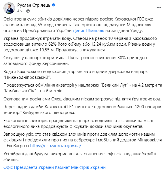 Об этом сообщил министр защиты окружающей среды и природных ресурсов Украины Руслан Стрелец в своем Facebook.