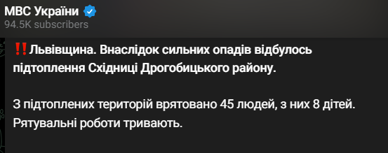 Также в МВД Украины сообщили, что с подтопленных территорий спасены 45 человек, из них 8 детей. В настоящее время спасательные работы продолжаются.