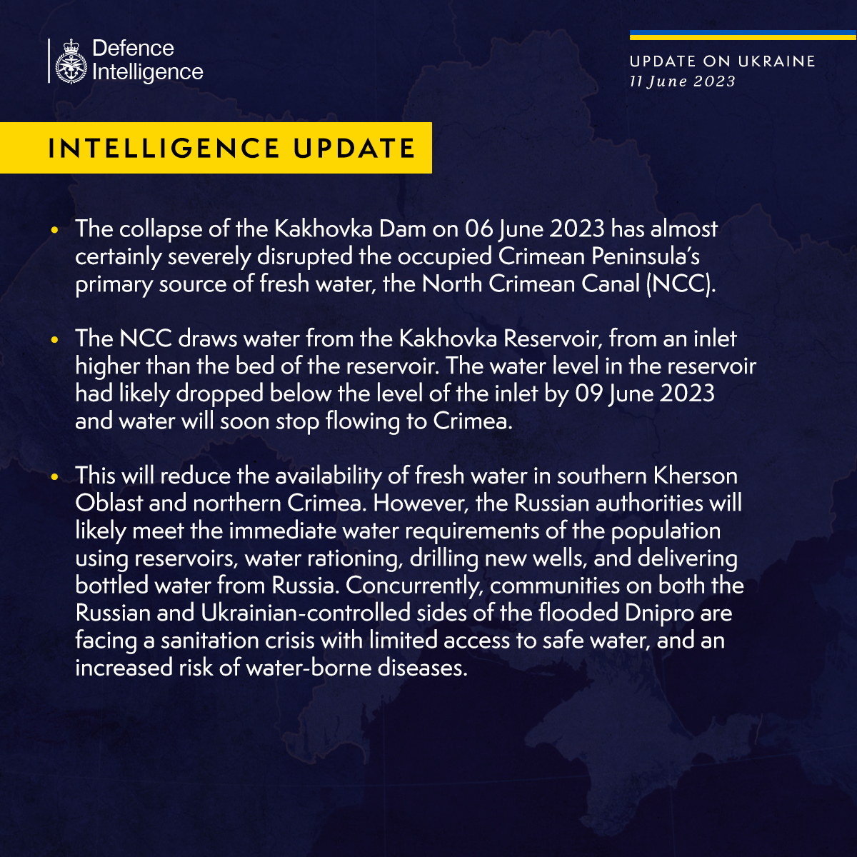 Северо-Крымский канал получает воду из Каховского водохранилища через водозабор, находящийся выше уровня дна водохранилища. В отчете говорится, что уровень воды в водохранилище, вероятно, опустился ниже уровня водозабора до 9 июня 2023 года, и поступление воды в Крым вскоре прекратится.