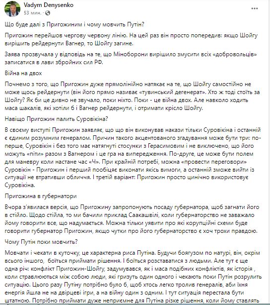 "Молчать и ждать в уголке, это отличительная черта Путина. Будучи трусом по натуре, он помимо всего прочего боится принимать решения. И боится расставаться с людьми. Но здесь есть еще одна вещь: конфликт Пригожин-Шойгу, задумывавшийся, как и масса подобных конфликтов, как история, когда стравливаются между собой люди, которые грызут друг друга и ждут пока Путин разрулит ситуацию. На этот раз Путину нужно было бы, чтобы кто-нибудь легко троллил генералов, чтобы их энергия шла не на дворцовые игры, а на войну друг с другом. И здесь ситуация перестала быть штатной. Нужно принимать очень неприятное для Путина резкое решение, когда ему ставят ультиматум: или один или другой. Он в силу своего психотипа такие ультиматумы не выносит. И потому держит паузу" - анализирует глава "Украинского института будущего".