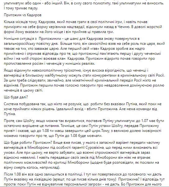 "Более того, он самостоятельно взял на себя роль пса царя, который щелкает на тех, кто мешает царю. Но первый свой "гав" Кадыров сделал слишком примитивно и получил ответ о том, что пригожинцы помнят первую и вторую чеченские войны и на чьей стороне воевал клан Кадырова. Пригожин открыто стал говорить о противопоставлении россиян и чеченцев в нынешних реалиях.