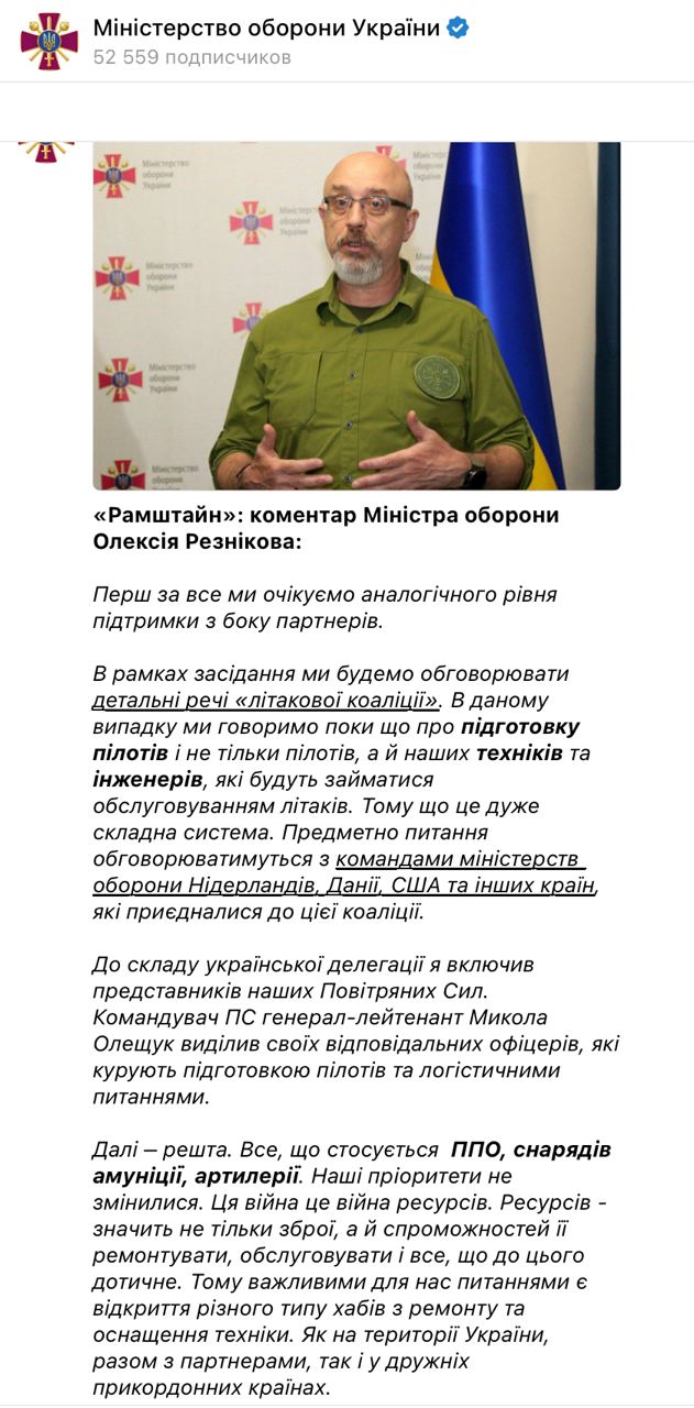 На ближайшем "Рамштайне" обсудят поставки истребителей Украине и подготовку пилотов - Резников
