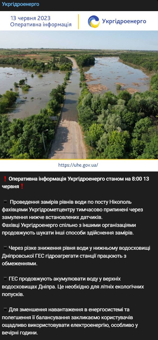 Ранее заявлялось, что уровень воды падает по 5 сантиметров в час. Последнее сообщение о глубине водохранилища в районе Никополя - 9,04 метра по состоянию на 12 июня.