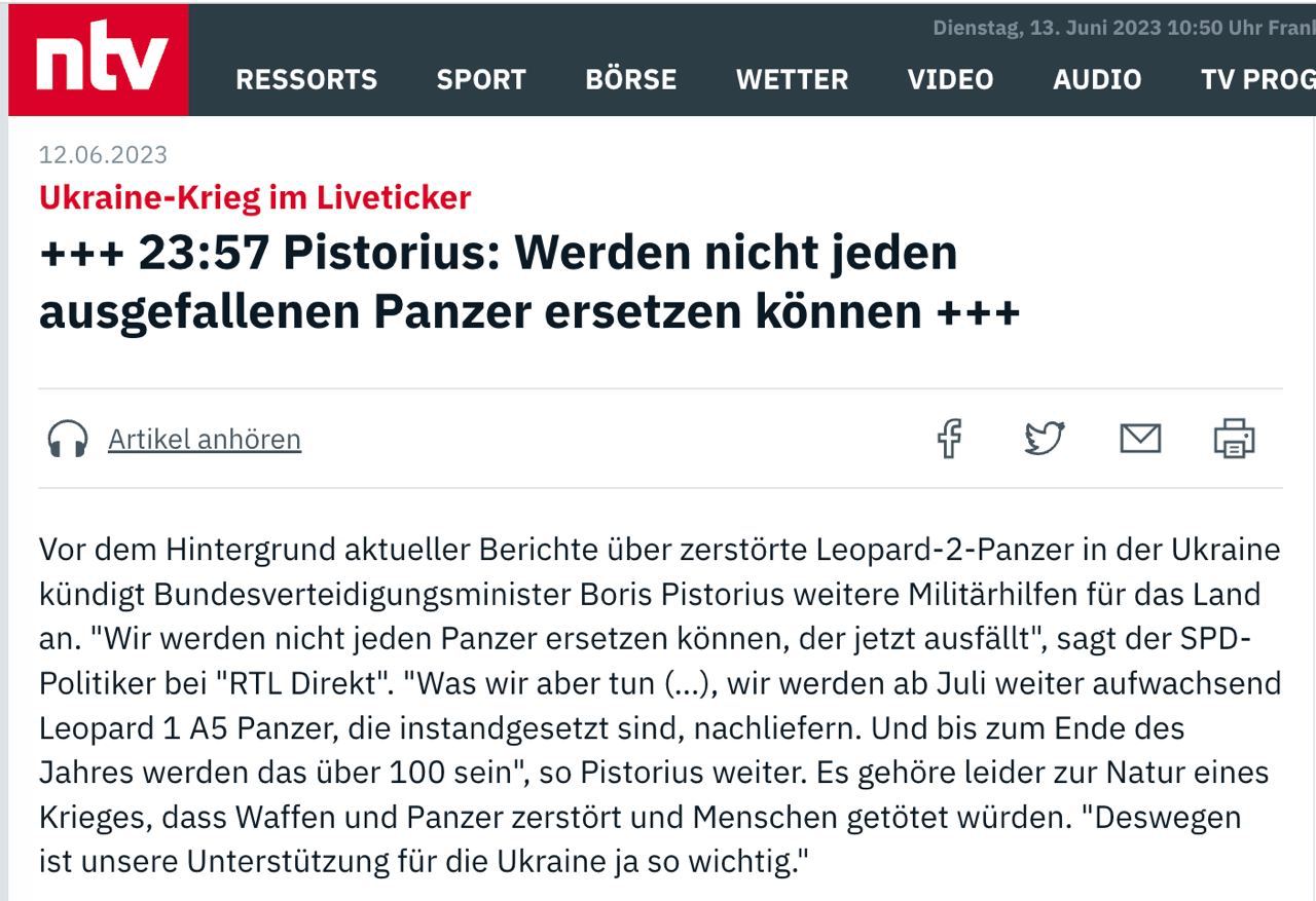Министр обороны ФРГ Борис Писториус заявил, что Германия не сможет заменить Украине каждый танк, потерянный в ходе наступления.