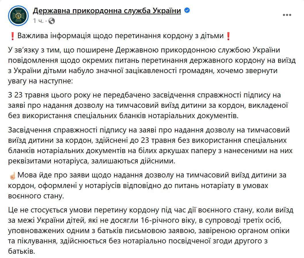 Это не касается условия пересечения границы во время действия военного положения, когда выезд за пределы Украины детей, не достигших 16-летнего возраста, в сопровождении третьих лиц, уполномоченных одним из родителей письменным заявлением, заверенным органом опеки и попечительства, осуществляется без нотариально удостоверенного согласия второго родителя.