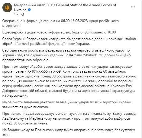В пятницу, 16 июня, Генштаб ВСУ обнародовал сводку о ситуации на фронте и сводку по атакам РФ.