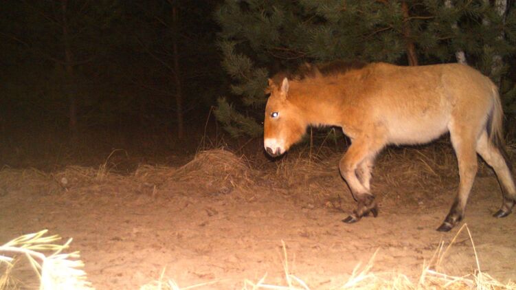 Животное на фото еще не взрослое, но уже и не жеребенок. Этот представитель дикой лошади Пржевальского почему-то ночью путешествует по лесу. Он то ли отстал от табуна, то ли не выспался (потому что, как правило, ночью лошади отдыхают), то ли попал в какой-то переплет. Как бы там ни было, копытное выглядит грустным.