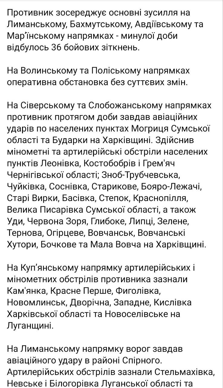 На данный момент противник сосредотачивает основные усилия на Лиманском, Бахмутском, Авдеевском и Марьинском направлениях - за прошедшие сутки произошло 36 боевых столкновений.