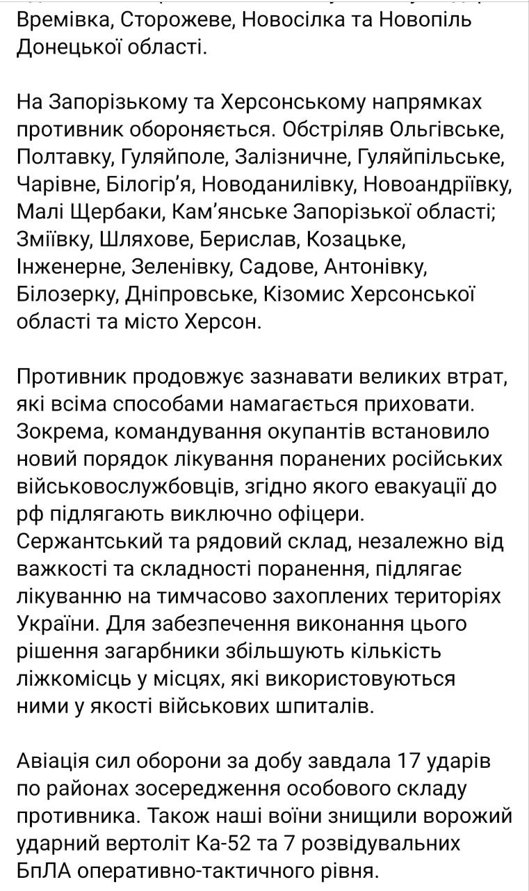 "Противник продолжает нести большие потери, которые всеми способами пытается скрыть. В частности, командование оккупантов установило новый порядок лечения раненых российских военнослужащих, согласно которому эвакуации в РФ подлежат исключительно офицеры. Сержантский и рядовой состав независимо от тяжести и сложности ранения подлежит лечению на временно захваченных территориях Украины", - говорится в сообщении Генштаба.