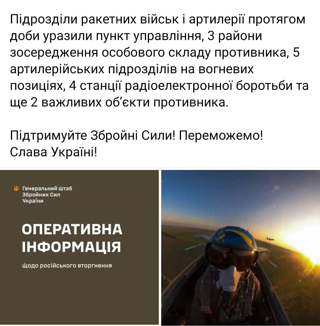 Кроме того, в течение суток противник нанес 33 авиационных удара и совершил 59 обстрелов из РСЗО. Генштаб предупреждает, что вероятность нанесения ракетных и авиационных ударов по всей территории Украины остается очень высокой.