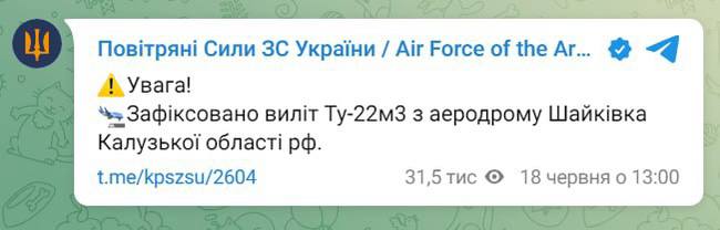13:06 Воздушные силы Украины предупреждает о взлете российских бомбардировщиков с аэродрома в Калужской области.
