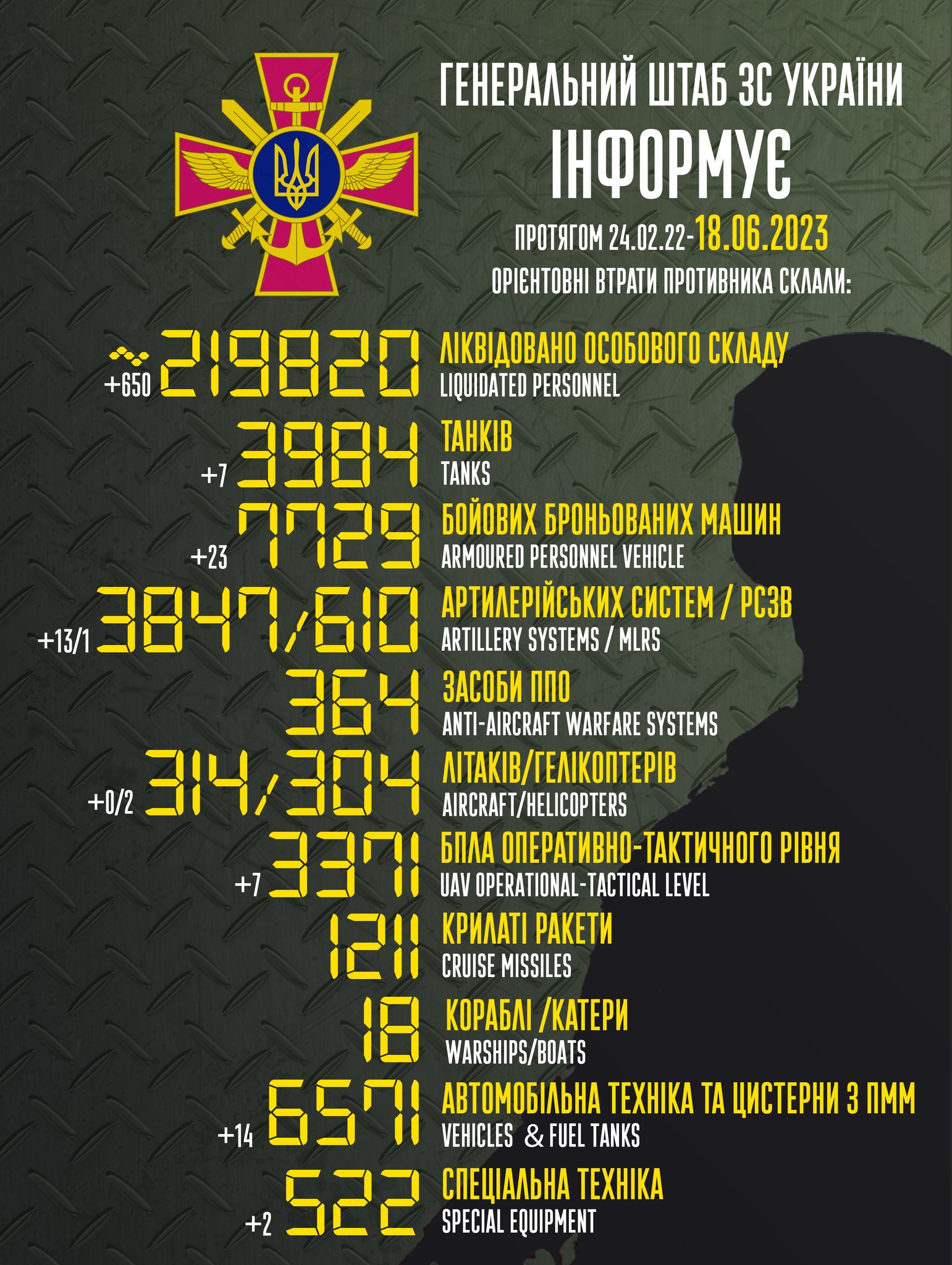Генштаб Вооруженных сил Украины (ВСУ) озвучил общие боевые потери армии РФ за время войны в Украине - с 24 февраля 2022 года по 18 июня 2023-го.