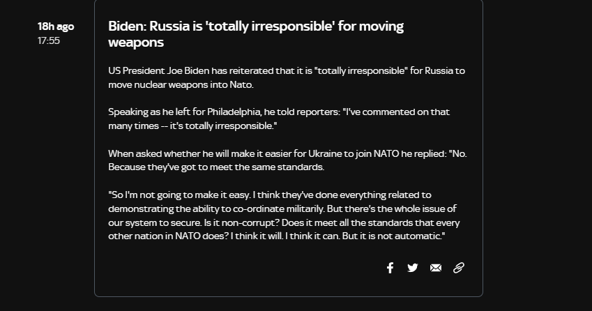 "Нет. Потому что они должны соответствовать одинаковым стандартам. Так что я не собираюсь упрощать это. Я думаю, что они сделали все, что связано с демонстрацией способности к военной координации... Она некоррумпирована? Соответствует ли она всем стандартам, которые выполняет каждая другая страна в НАТО? Я думаю, что это будет. Я думаю, что это возможно. Но это не автоматически", - объяснил Байден.