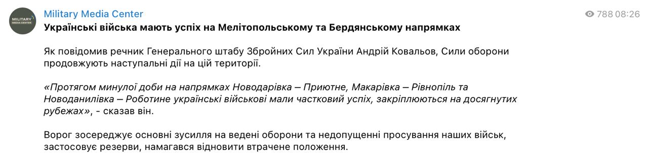 "За прошедшие сутки на направлениях Новодаровка – Приютное, Макаровка – Ровнополь и Новоданиловка – Роботино украинские военные имели частичный успех, закрепляются на достигнутых рубежах", - сообщил представитель Генштаба Андрей Ковалев.
