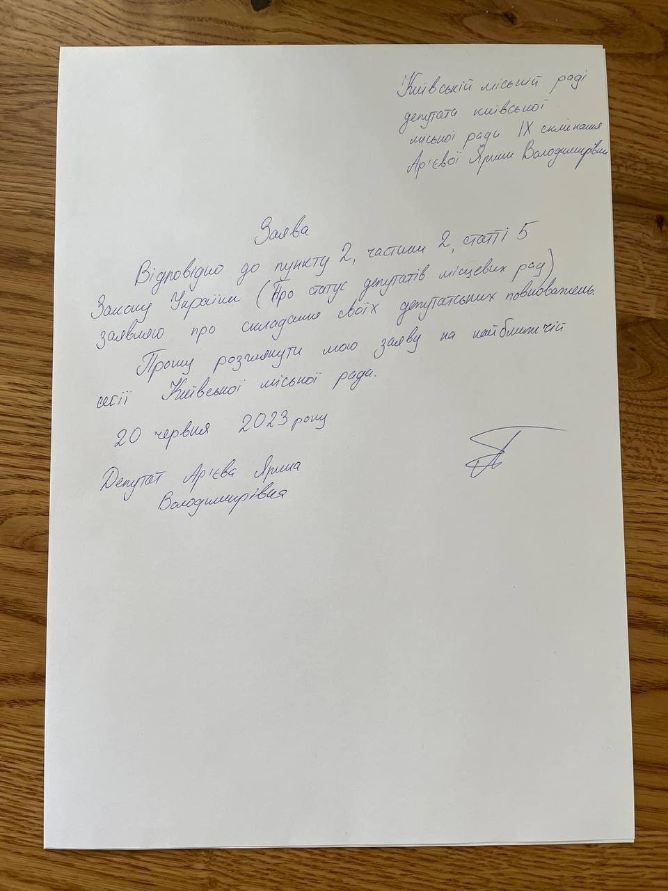 Об этом сообщила ее коллега по партии (Евросолидарность-БПП) Ирина Геращенко и опубликовала фото заявления.