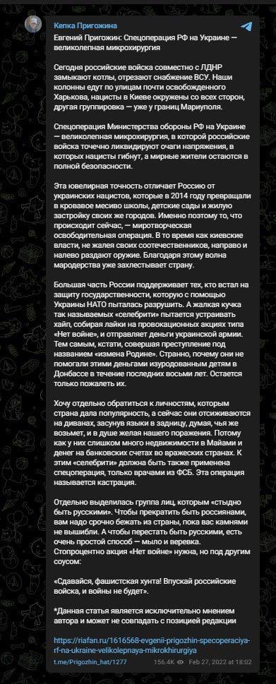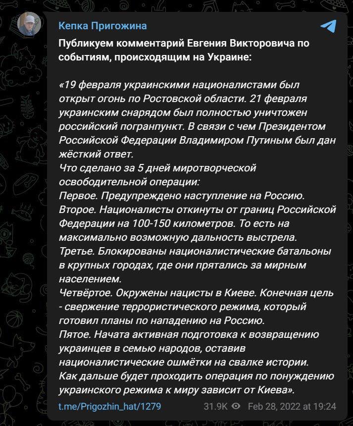 Для полноты картины относительно "прозрения" Пригожина по поводу войны в Украине мы публикуем скрины его же заявлений конца февраля 2022 года, в которых он горячо поддержал "спецоперацию". Он заявлял тогда, что Путин "сделал все абсолютно правильно" и "предупредил нападение на Россию". А саму "спецоперацию минобороны РФ" он назвал "великолепной микрохирургией, в которой российские войска точечно ликвидируют очаги напряжения, а мирные жители остаются в полной безопасности".