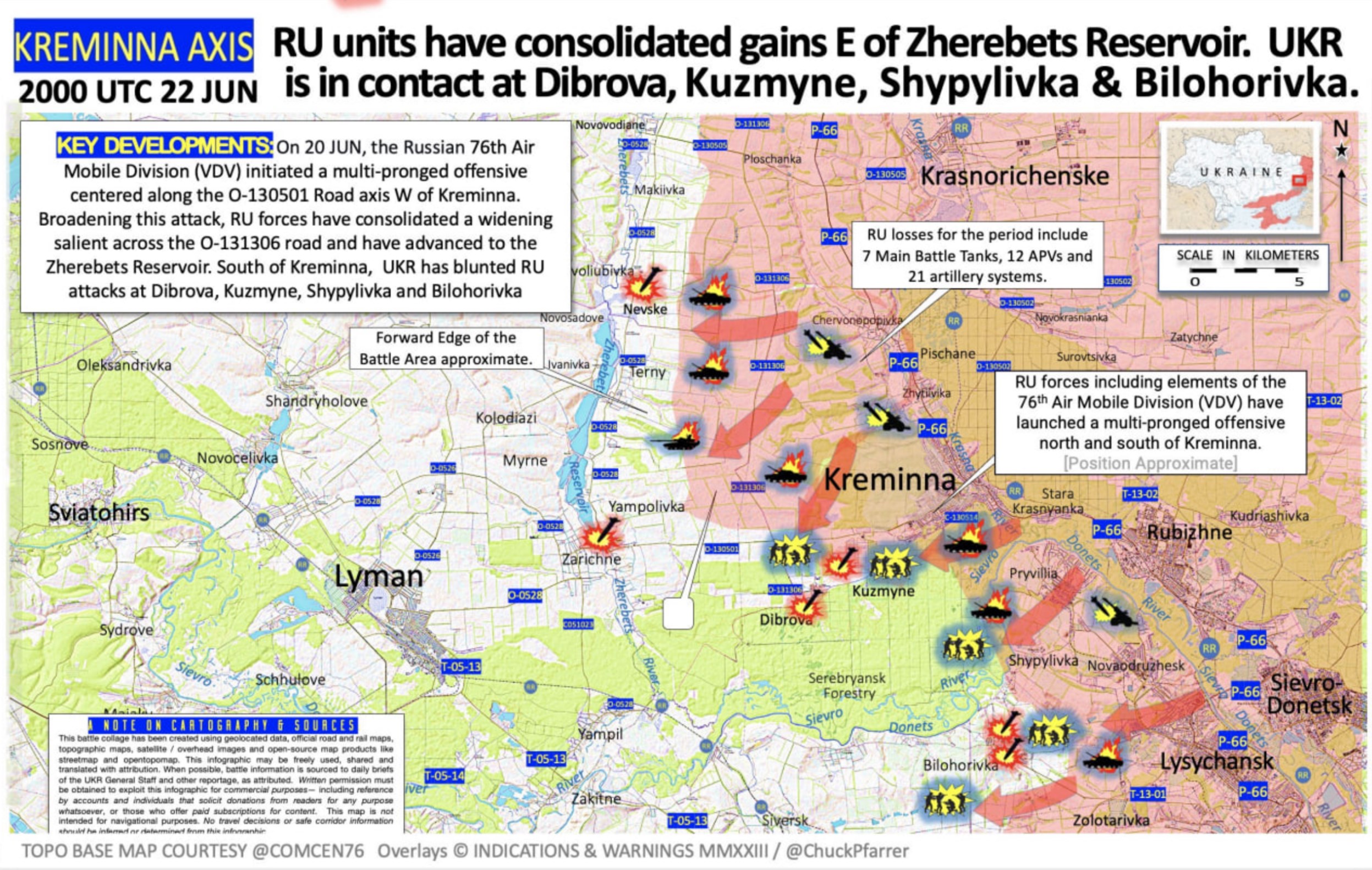 "Силы РФ начали многостороннее наступление, сосредоточенное на оси дороги O-130501 западнее Кременной. Расширяя эту атаку, российские войска закрепили расширяющийся выступ через автодорогу O-131306 и продвинулись к Жеребецкому водохранилищу", - сообщил аналитик.