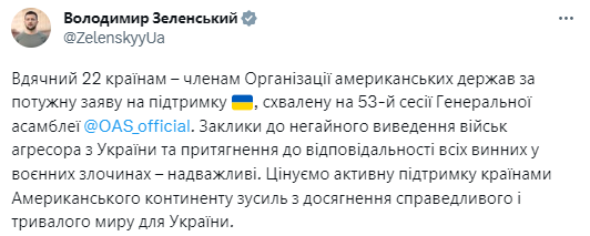 Зеленский выразил благодарность 22 странам-членам Организации американских государств за заявление в поддержку Украины. Заявление, которое было одобрено на 53-й сессии Генассамблеи организации, призывает немедленно вывести войска агрессора из Украины и привлечь всех виновных в военных преступлениях к ответственности.