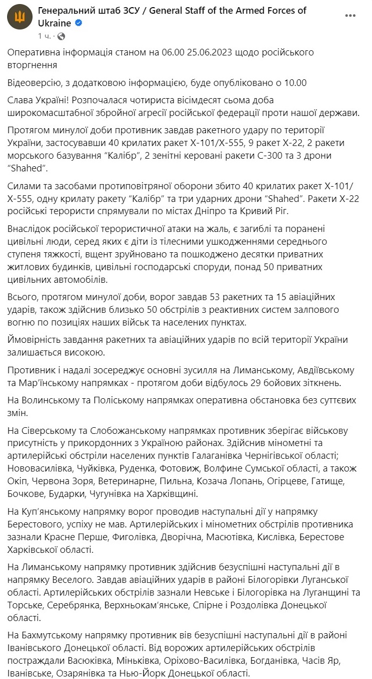Что происходит на фронте 25 июня. Сводка Генштаба ВСУ