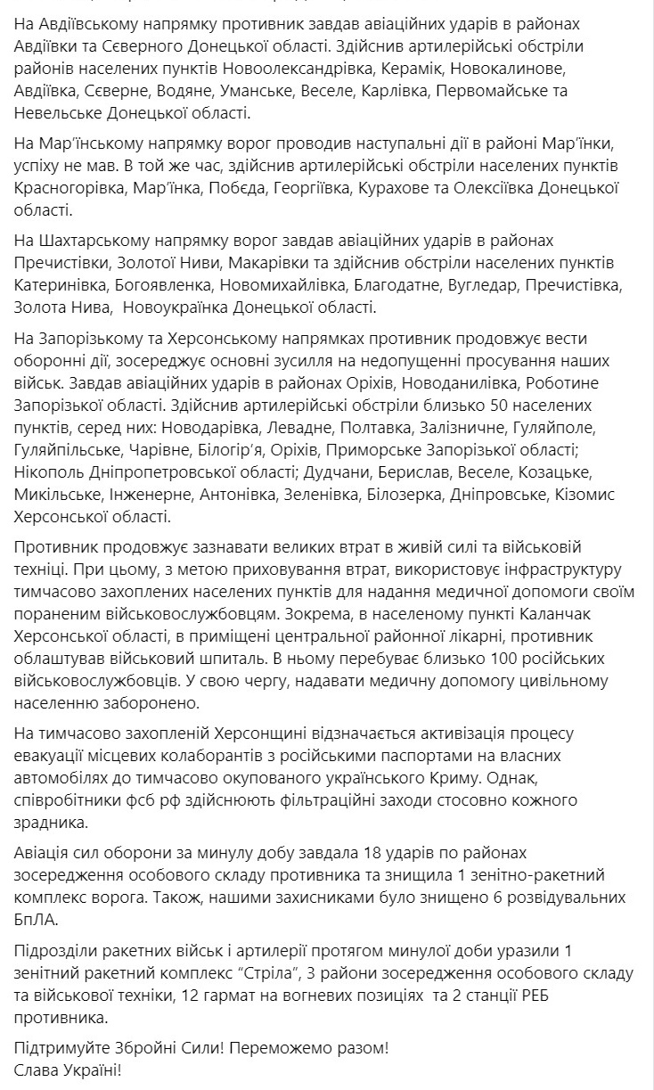 Российские войска сосредотачивают основные усилия на Лиманском, Авдеевском и Марьинском направлениях. За эти сутки произошло 29 боевых столкновений.