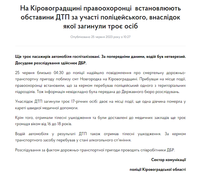 В Кировоградской области рядом с поселком Новгородка, произошло смертельное ДТП, в результате которого погибли трое несовершеннолетних, еще трое подростков госпитализированы.