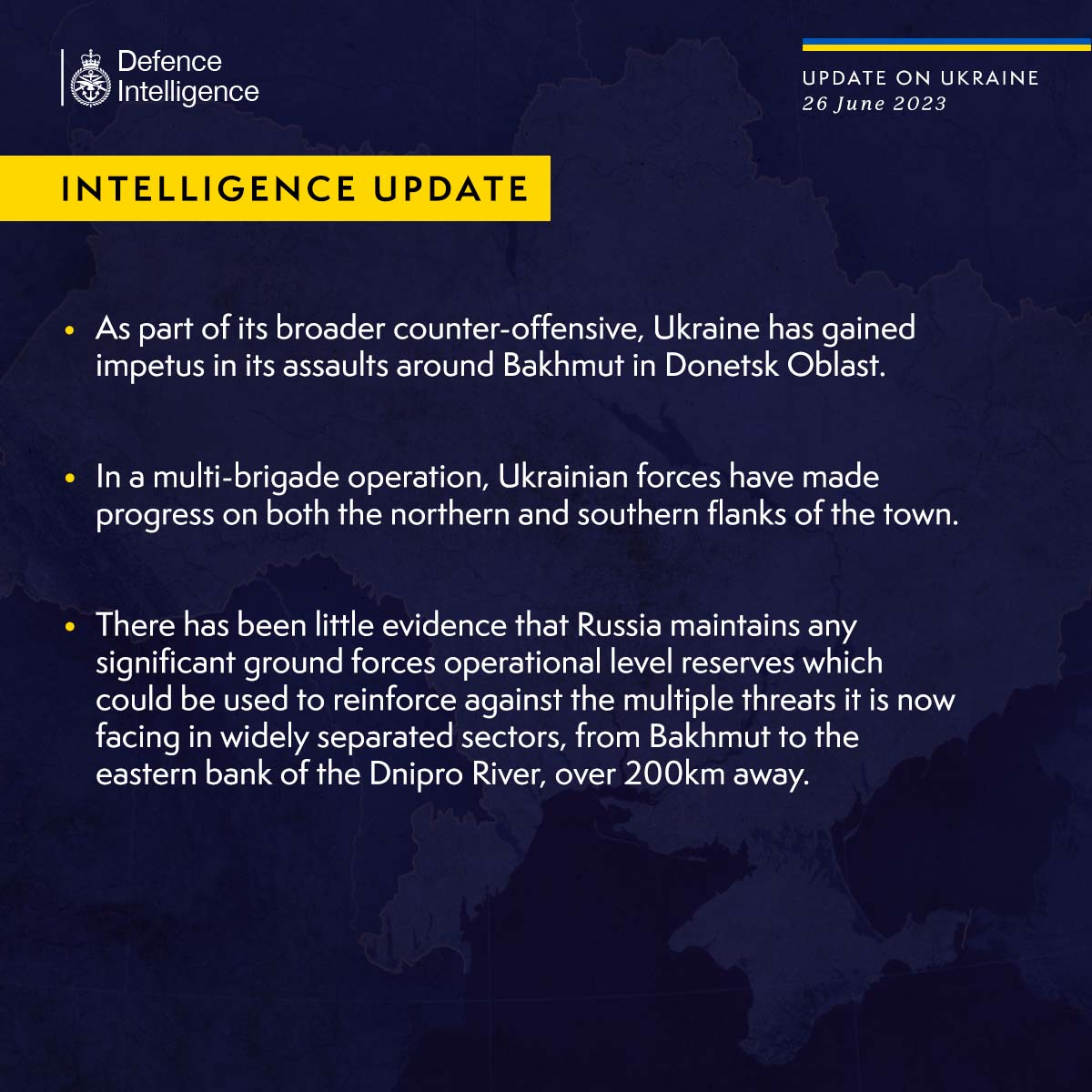 При этом в Британии отмечают, что существует мало свидетельств того, что Россия имеет какие-либо значительные оперативные резервы сухопутных войск, которые можно было бы использовать для усиления противодействия многочисленным угрозам, с которыми она сейчас сталкивается в удаленных друг от друга секторах, от Бахмута до восточного берега реки Днепр, на расстоянии более 200 км.