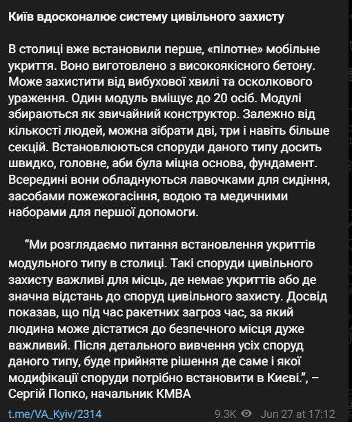 Рассматривается вопрос дальнейшей установки таких укрытий модульного типа в Киеве. Внутри таких укрытий ставят лавочки для сидения, средства пожаротушения, воду и медицинские наборы для первой помощи.