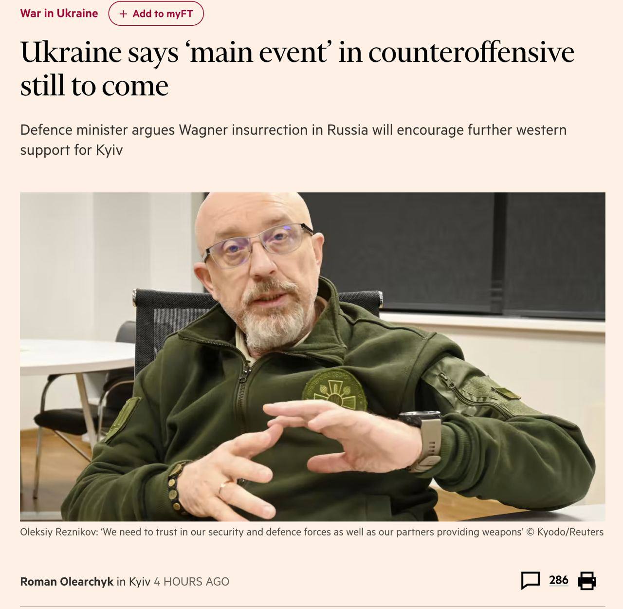 Главный удар ВСУ в ходе летнего контрнаступления еще впереди, заявил министр обороны Алексей Резников в комментарии The Financial Times.