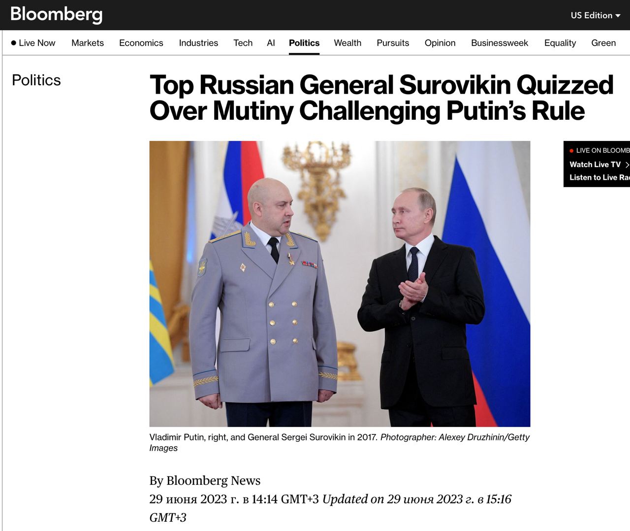 Вскоре после выхода материала Financial Times агентство Bloomberg тоже сообщило о задержании Суровикина. По данным источников издания, военная прокуратура допрашивала его в течение нескольких дней. Bloomberg пишет, что сейчас Суровикин содержится в "одном месте", но не в тюрьме.