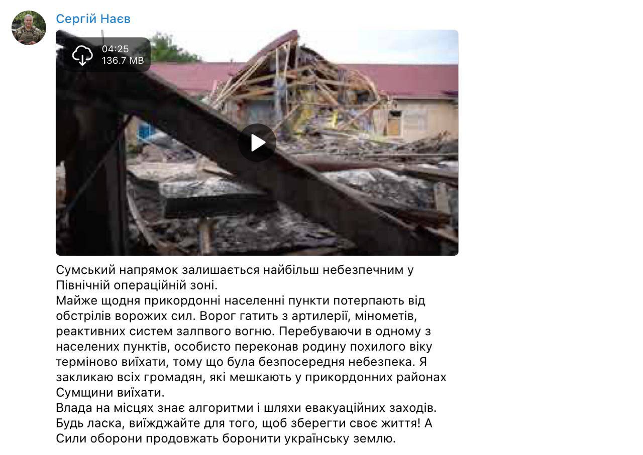 "Почти каждый день приграничные населенные пункты подвергаются обстрелам вражеских сил. Враг лупит из артиллерии, минометов, реактивных систем залпового огня. Я призываю всех граждан, проживающих в приграничных районах Сумщины, уехать. Пожалуйста, уезжайте для того, чтобы сберечь свою жизнь!" - написал Наев.