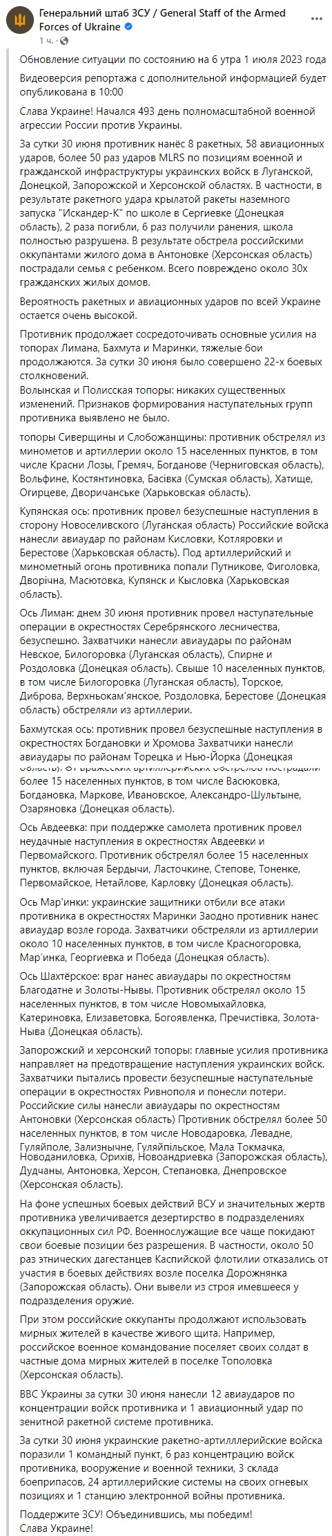 Тем временем война в Украине идет 493-й день. Мы следим за новостями 1 июля 2023 года в своем онлайне.