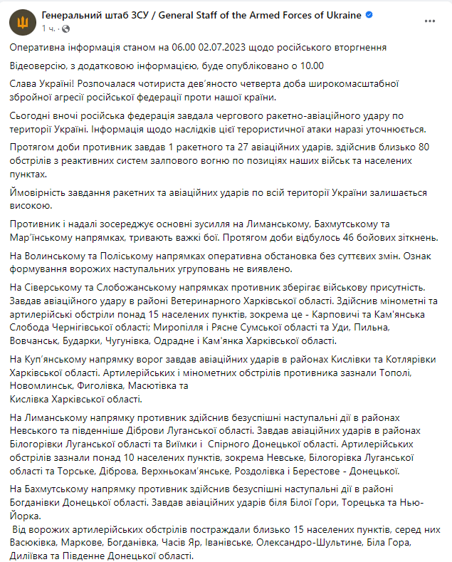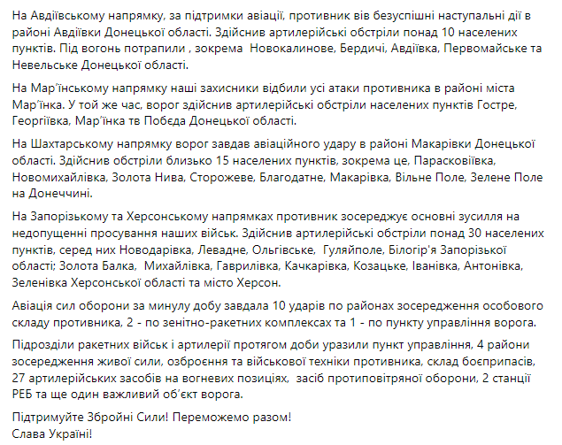 Сообщается, что в течение суток противник нанес 1 ракетный и 27 авиационных ударов, совершил около 80 обстрелов из реактивных систем залпового огня по позициям украинских войск и населенным пунктам.