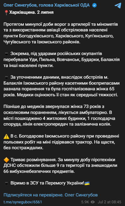 "За прошедшие сутки враг из артиллерии и минометов и с использованием авиации обстреливал населенные пункты Богодуховского, Харьковского, Купянского, Чугуевского и Изюмского районов. В частности, под ударами российских оккупантов находились Уды, Пыльная, Волчанск, Бударки, Балаклея и другие населенные пункты", - пишет Синегубов.