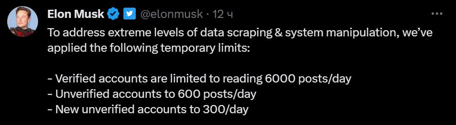 Теперь верифицированные аккаунты временно ограничены чтением 6000 сообщений в день, неверифицированные – 600 в день, а новые неверифицированные аккаунты - 300.