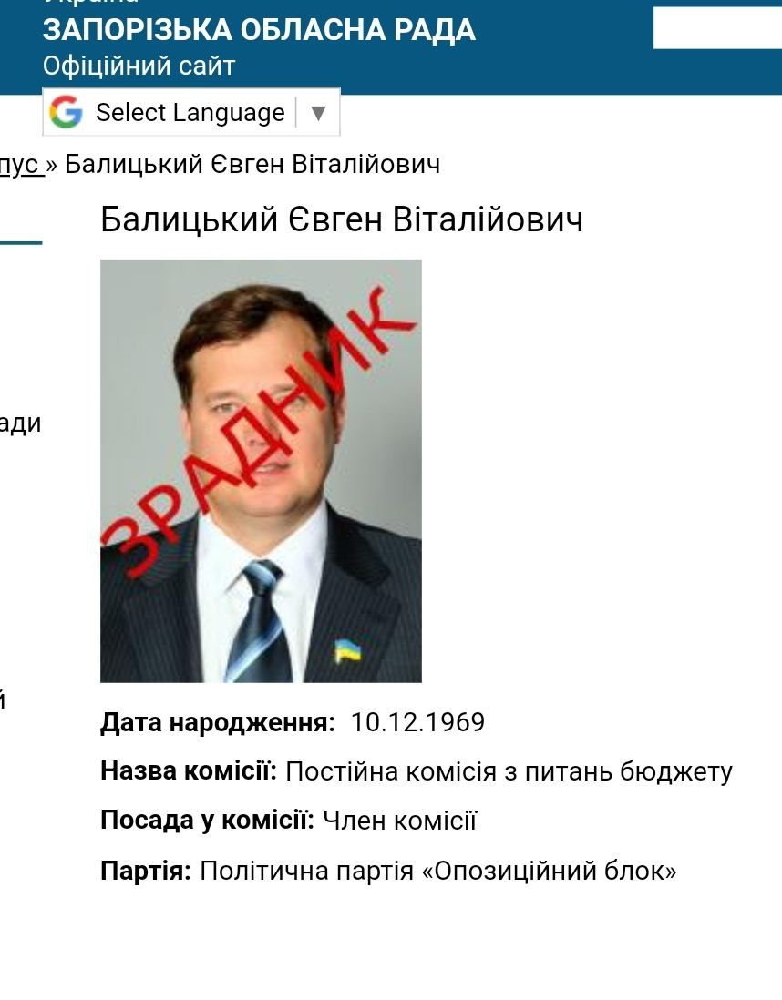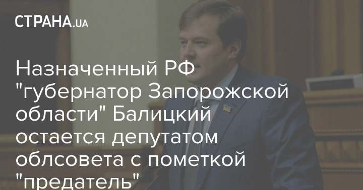 Назначенный Россией "губернатор Запорожской области" Евгений Балицкий до сих пор остаётся депутатом Запорожского областного совета.
