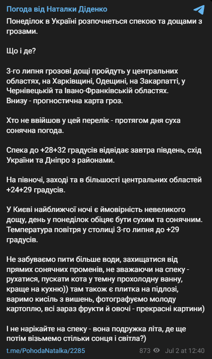 "3-го июля грозовые дожди пройдут в центральных областях, Харьковской, Одесской, Черновицкой, Ивано-Франковской областях и на Закарпатье. Кто не вошел в этот список – в течение дня сухая солнечная погода", - пишет Диденко.