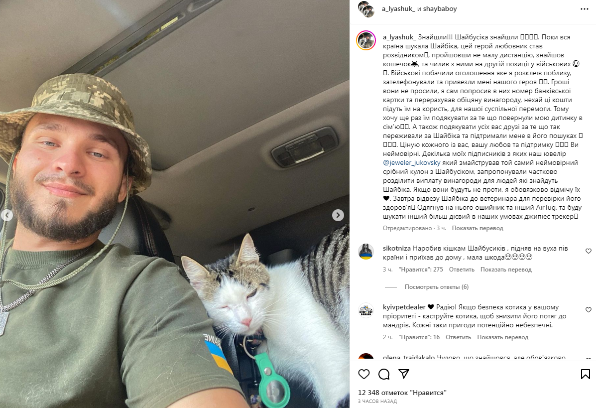 "Военные увидели объявление, которое я расклеил поблизости, позвонили и привезли мне нашего героя. Деньги они не просили, я сам взял у них номер банковской карты и перечислил обещанное вознаграждение, пусть эти средства пойдут им на пользу для нашей общей победы", - написал Ляшук.