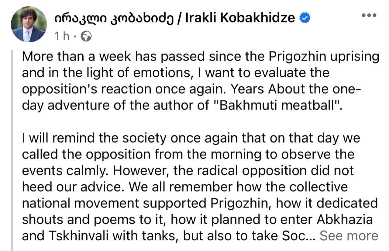 Председатель правящей партии "Грузинская мечта" Ираклий Кобахидзе заявил, что грузинская оппозиция поддержала мятеж Евгения Пригожина в РФ, рассчитывая, в случае его успеха, открыть "второй фронт" против России в Абхазии и Южной Осетии.