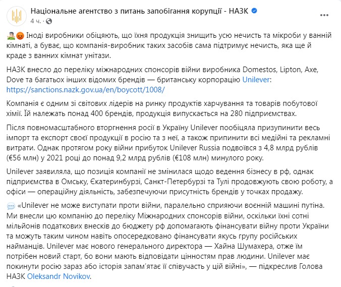 "После полномасштабного вторжения России в Украину Unilever пообещала приостановить весь импорт и экспорт своей продукции в Россию и из нее, а также прекратить все медийные и рекламные расходы. Однако за год войны прибыль Unilever Russia удвоилась с 4,8 млрд рублей (€56 млн) в 2021 году до более 9,2 млрд рублей (€108 млн) в прошлом году", - отметили в НАПК.