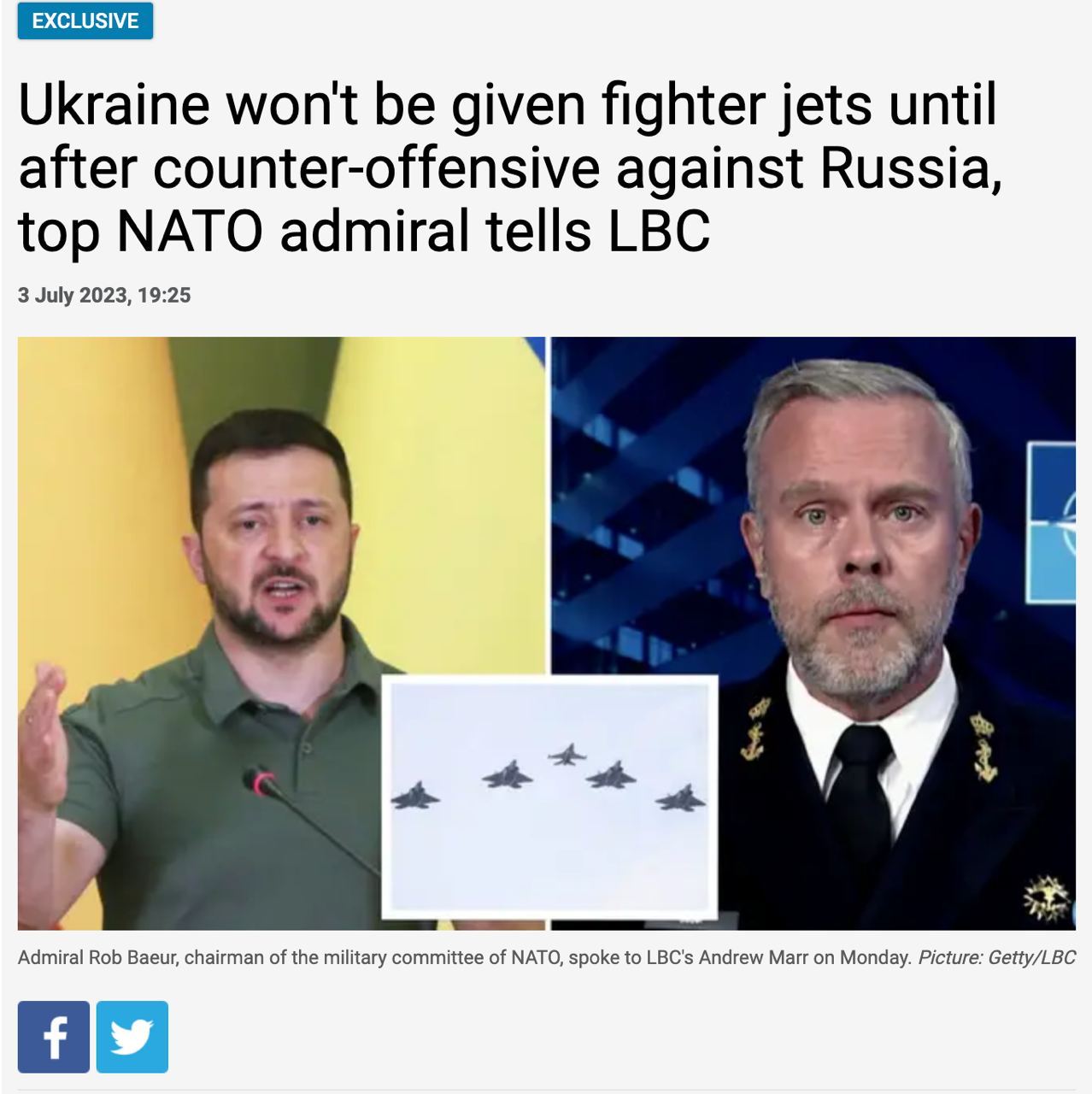 Ранее главком Залужный упрекнул западных союзников, что те толкают его в наступление без авиации, хотя доктрина НАТО подразумевает превосходство в воздухе для начала наземных операций глубокого проникновения.