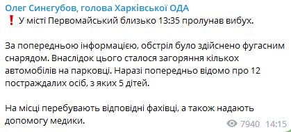 В городе Первомайский Харьковской области в результате обстрела пострадали 12 человек, в том числе пятеро детей. Об этом сообщает глава Харьковской ОВА Олег Синегубов в телеграм-канале.