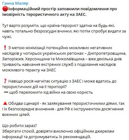 Она отметила, что информационный простор заполнили сообщения о возможном террористическом акте на ЗАЭС.