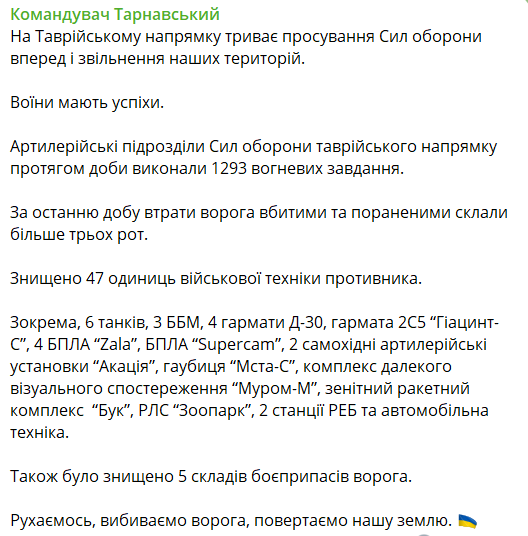 "Артиллерийские подразделения Сил обороны таврического направления в течение суток выполнили 1293 огневых задач. За последние сутки потери врага убитыми и ранеными составили более трех рот", - написал Тарнавский.