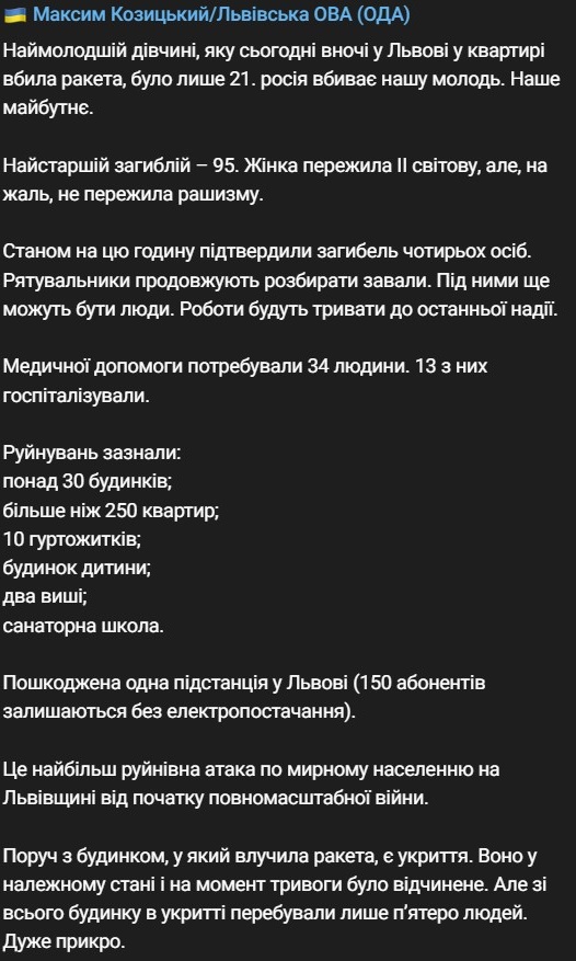 "Самой молодой девушке, которую сегодня ночью во Львове в квартире убила ракета, был всего 21 год. Россия убивает нашу молодежь. Наше будущее.