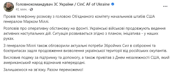 "Рассказал об оперативной обстановке на фронте. Украинские военные продолжают ведение активных наступательных действий. Ситуация развивается согласно плану, инициатива – в наших руках. С генералом Милли также обсудили актуальные потребности вооруженных сил в вооружении и боеприпасах для продолжения освобождения украинской территории от российских оккупантов. Поблагодарил за поддержку и помощь, а также поздравил с Днем независимости США, который американский народ отметил накануне", - сказано в посте.