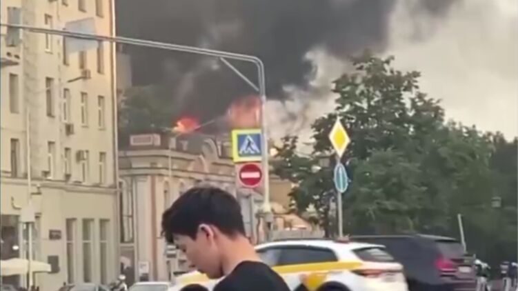 На кадрах видно, что из здания идет густой черный дым, отчетливо прослеживаются языки пламени.
