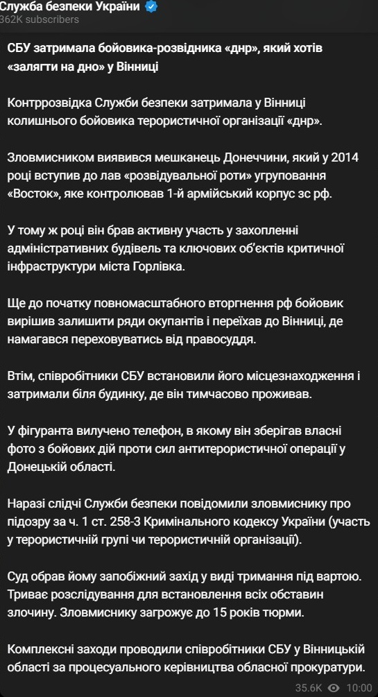 В результате операции контрразведки Службы безопасности Украины (СБУ) в городе Винница был задержан воевавший ранее за "ДНР" житель Донбасса.