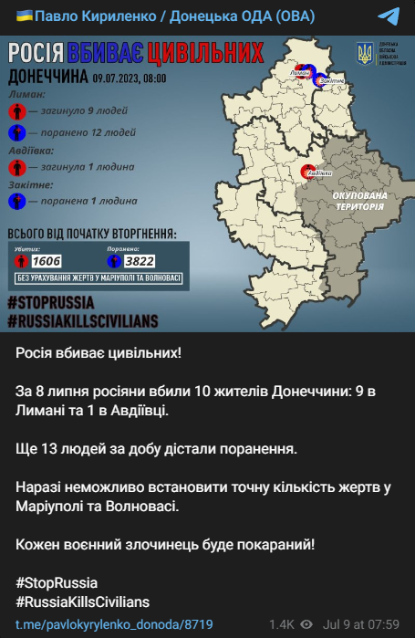 "За 8 июля россияне убили 10 жителей Донбасса: девять в Лимане и один в Авдеевке. Еще 13 человек за сутки получили ранения", - написал Кириленко.